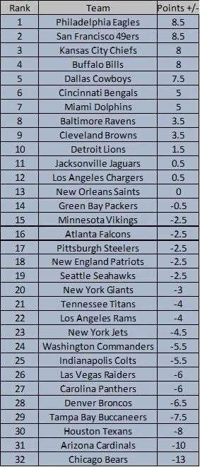 An easy way to explain this is using an example from the list below. The Bills are currently my highest rated team and they are 8 points better than an average team. The average team is 0 points. So, from my power rankings if the Bills played the Chargers, I believe they should be 8 point favorites on neutral field. There are variables that are not inherent in this list, such as home-field advantages, injuries and other unknown intangibles. The list assumes point differential on a neutral field. If Buffalo is playing the Chargers in Los Angeles, according to my Power Rankings, Buffalo should be about a 7 point favorite (accounting for a Chargers 1-point home field advantage). Another example from the list below is the Patriots should be an 8.5 point favorite over the Carolina Panthers on a neutral field. If the game was in Carolina, the Patriots should be a 6.5 point favorite. If the game was in Foxborough, the Patriots should be an 11 point favorite, according to my power rankings.
